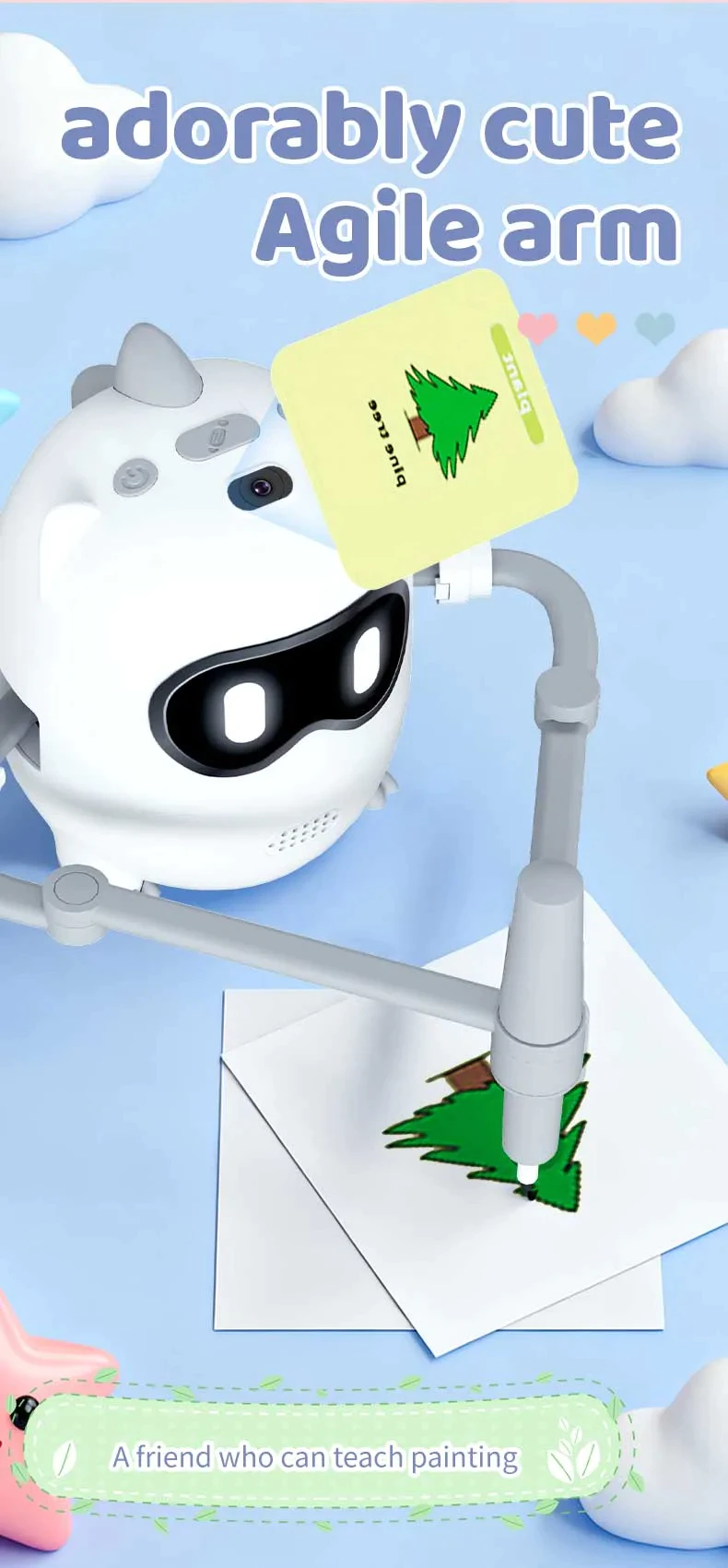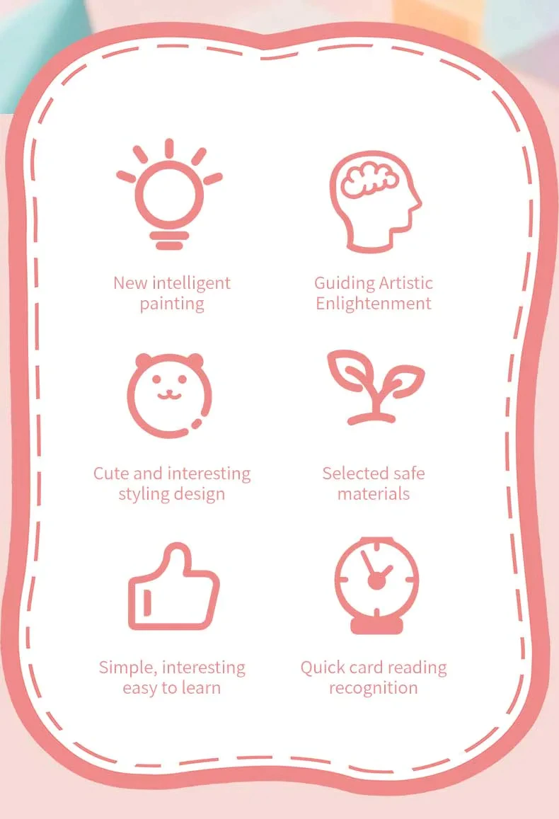 【High-quality & Safe Design】The interactive painting robot is made of high-quality child-safe materials with child safety as the purpose. The cute and beautiful appearance and safe materials can ensure that children can learn drawing happily in a safe environment.