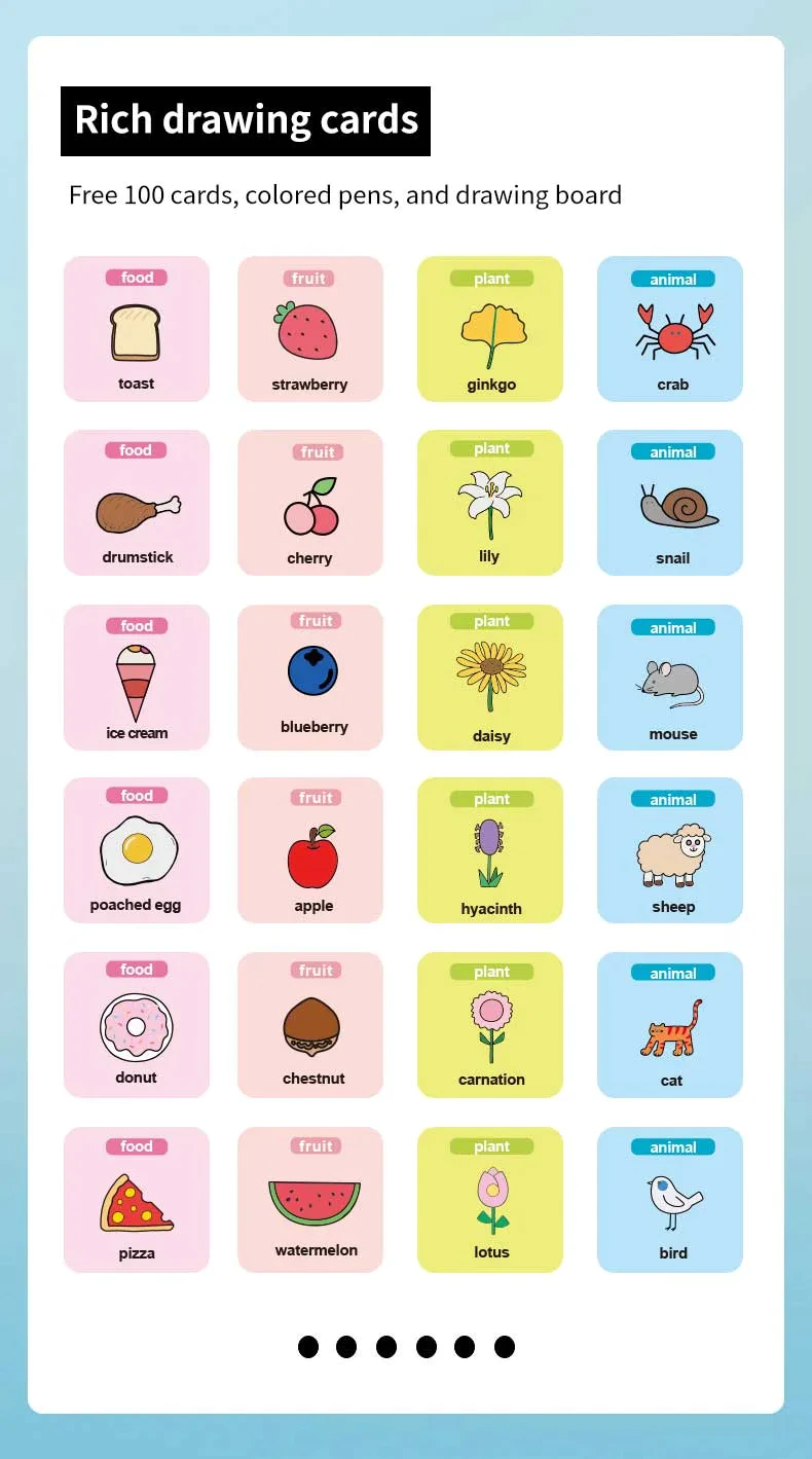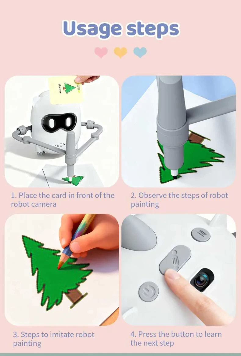 【User-Friendly Operation】Effortlessly start the fun, no APP needed. Just insert the 100 included drawing cards and press the button, and the robot will start painting. Children can learn words and painting with the drawing robot. Drawing cards include different categories such as animals, plants, transportation, food, etc.