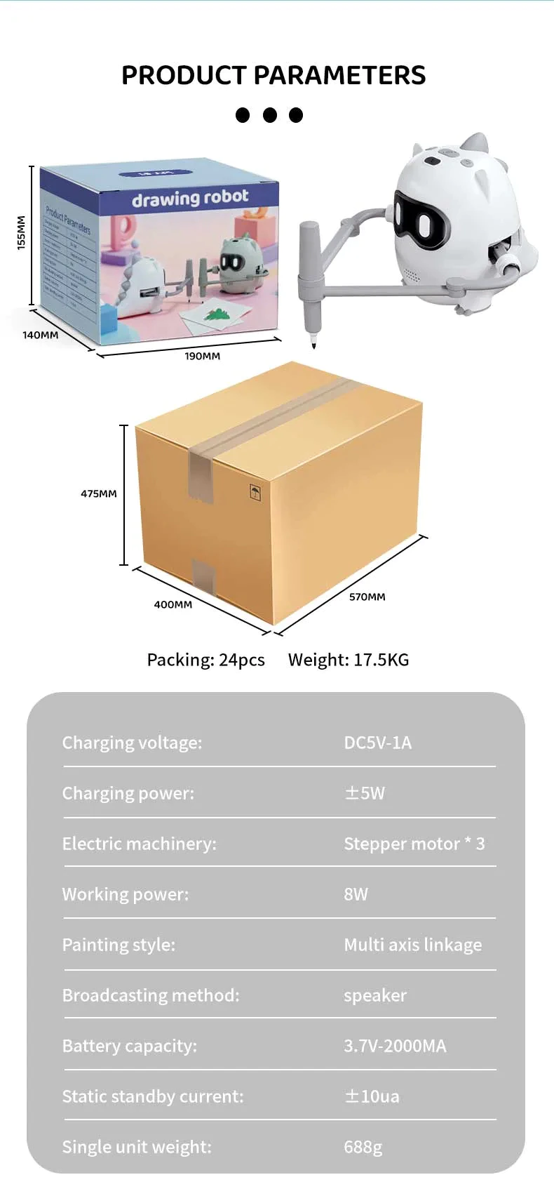 【100 Drawing Cards】ERYMCS drawing robot kit includes: 1*drawing robot, 100*drawing cards, 10*drawing pens, 12*color pens, 1* charging cable, 1*instruction manual.